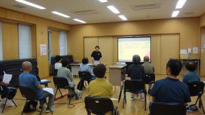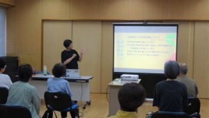初めの30分はパワーポイントを用いて「笑い」がもたらす健康効果を説明いただき、その後1時間は認知症予防ゲームと笑いヨガの実践を行いました。とてもわかり易い講話と楽しい笑いヨガの体験が出来ました。笑いヨガは、リズムよく笑いと掛け声を切り替えながら行うので、体操の要素もあり、終わった時には参加者は心も体も爽快な気分になり、とても楽しい講座になりました。