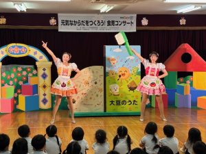 就学前の子ども達を対象に、「大豆のうた」をとおして、楽しい歌や踊りなどにより、栄養豊かな大豆やバランスのとれた食事、規則正しい食生活の大切さなどを伝えるコンサートを開催しました。今回は、姫路ひまわり保育園の107名のみなさんにご参加いただきました。
