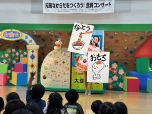 就学前の子ども達を対象に、「大豆のうた」をとおして、楽しい歌や踊りなどにより、栄養豊かな大豆やバランスのとれた食事、規則正しい食生活の大切さなどを伝えるコンサートを開催しました。今回は、二葉にじいろこども園の74名のみなさんにご参加いただきました。