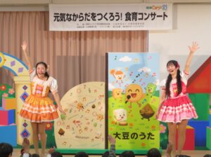就学前の子ども達を対象に、「大豆のうた」をとおして、楽しい歌や踊りなどにより、栄養豊かな大豆やバランスのとれた食事、規則正しい食生活の大切さなどを伝えるコンサートを開催しました。今回は、三田市立みつば幼稚園の104名のみなさんにご参加いただきました。