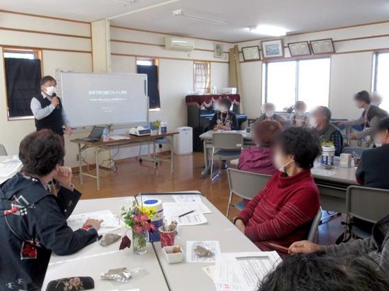 11月16日(日) 花のつどいサロン 「地域で取り組むフレイル予防」 田和 厚美 氏 2025/11/27 講座日 令和7年11月16日(日) 会 場 香呂・香呂南地区県民交流会館 団体名 NPO法人 人・こころネット テーマ 「地域で取り組むフレイル予防」 講 師 理学療法士 田和 厚美 氏 分 野 からだ フレイル予防について、高齢者の現状を知り、運動・食事・社会参加が大切なことの説明があった。その中で、簡単にできるフレイル予防の運動の紹介があり、椅子からの立ち上がり、膝の伸展など先生と一緒にやってみた。簡単にできることだが、続けることが難しいので、誰かと一緒にするのがいいと。納得できました。