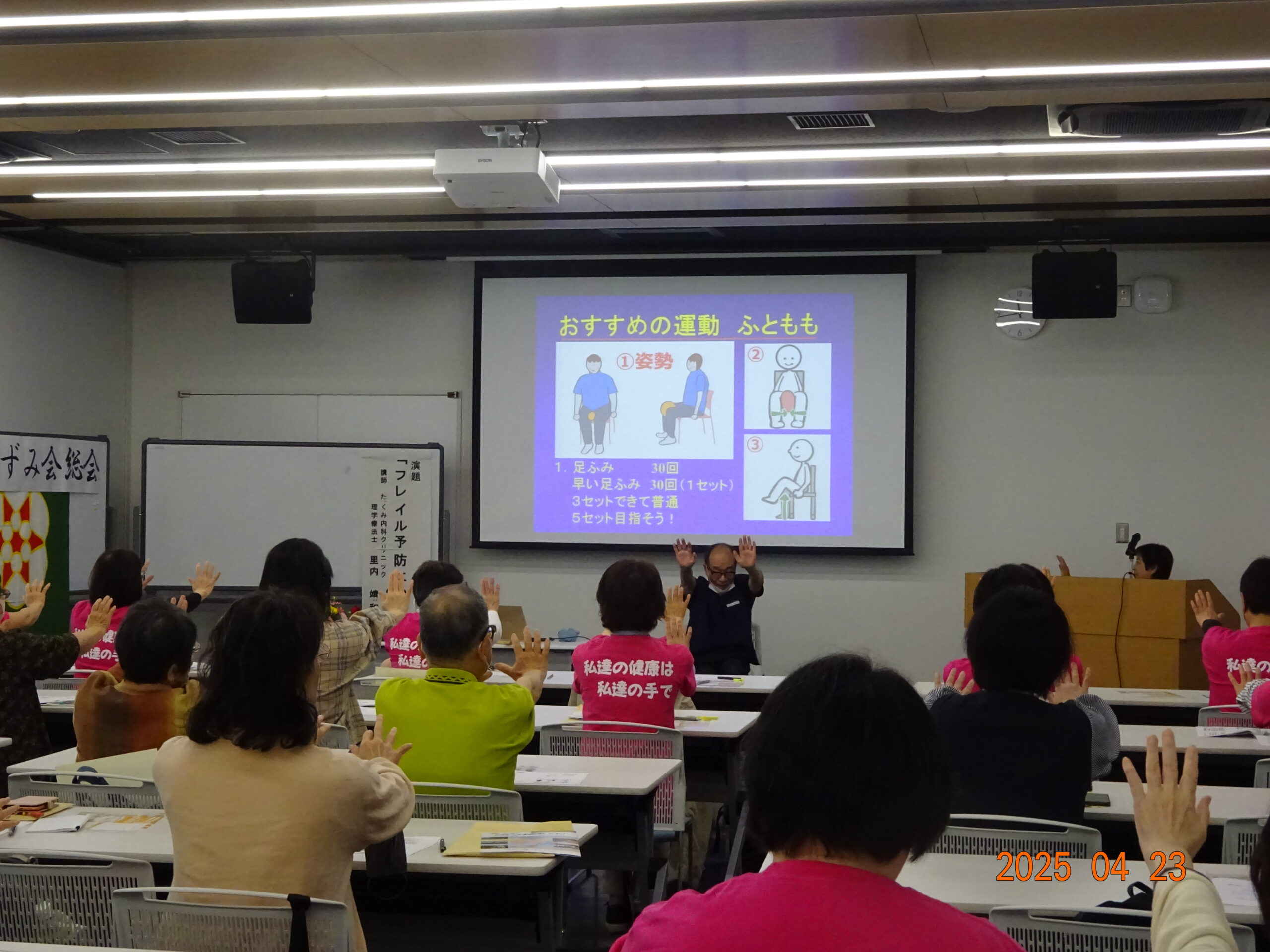 4月23日(水)高砂いずみ会総会・研修会「フレイル予防について」里内 靖和 氏 2025/12/09 講座日 令和7年4月23日(水) 会 場 高砂市役所 分庁舎 会議室 団体名 高砂いずみ会 講 師 理学療法士 里内 靖和 氏 分 野 からだ(運動) 分かりやすく、楽しい研修会で参加者の皆さんに大変好評でした。また先生に来てもらいたいという意見を沢山いただきました。