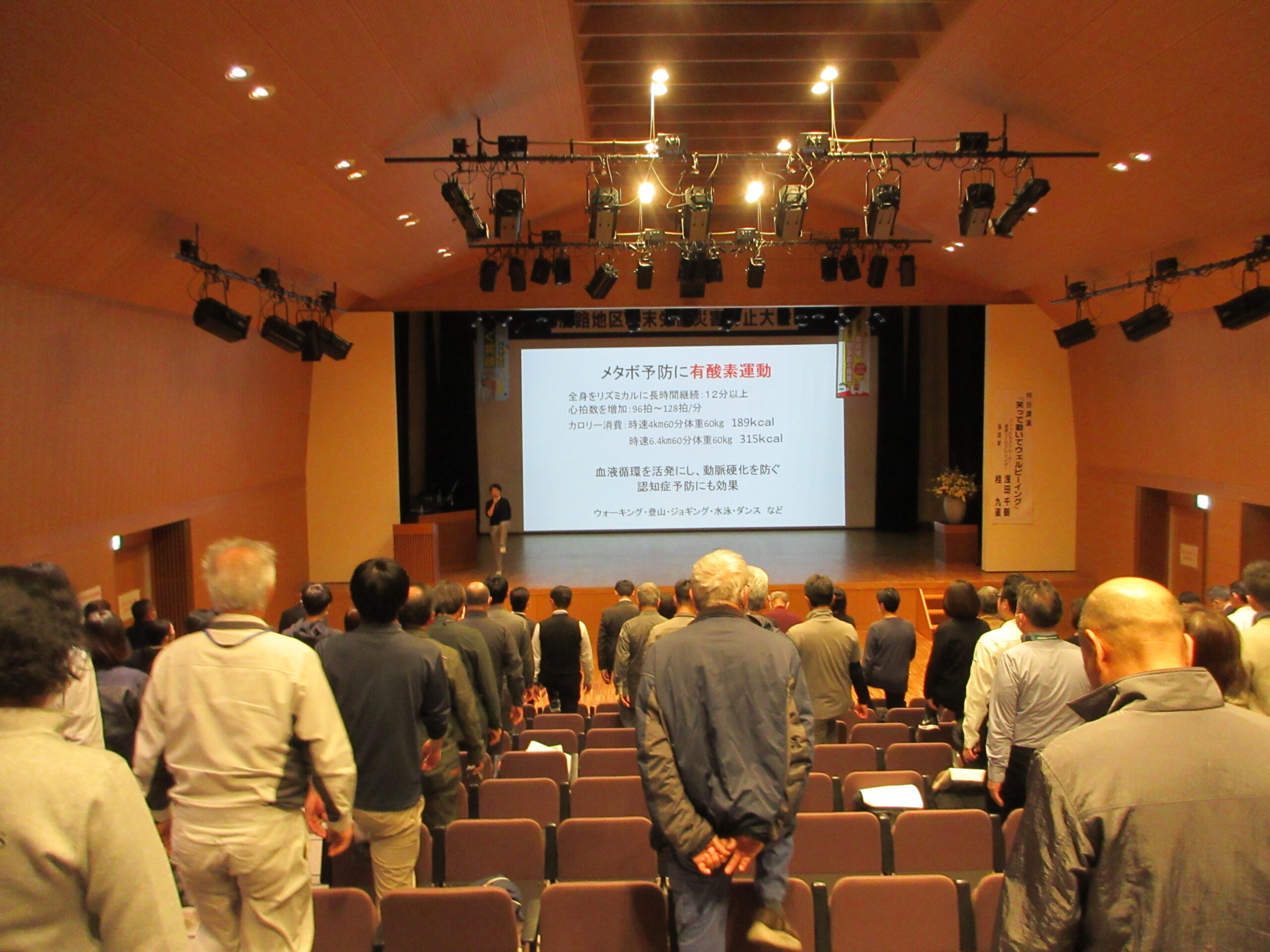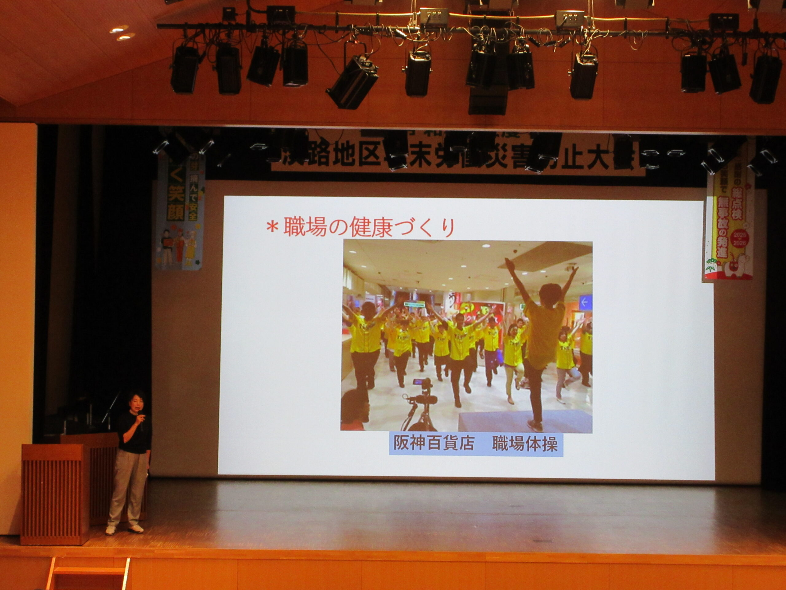 健康落語「SKvsNK」のあと、働き盛りの方々を対象に健康づくりの講演を行い、楽しいひとときを過ごすことができました。「淡路地区年末労働災害防止大会」は年末の慌ただしい時期ですが、労働災害が無い様参加者に意識高揚を図っていただきました。